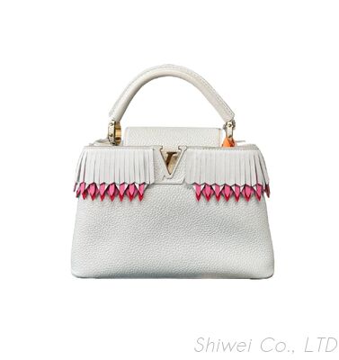 The Louis Vuitton Capucines BB Lucky Ribbon is a true statement piece, crafted from luxurious white Taurillon leather. This exquisite handbag features the iconic LV initials and is adorned with playful fringed detailing in white, pink, and red, resembling lucky ribbons. The structured silhouette, top handle, and gold-tone hardware offer both elegance and modern flair. With its compact size and eye-catching design, this Capucines BB is perfect for adding a touch of sophistication and individuality to any ensemble