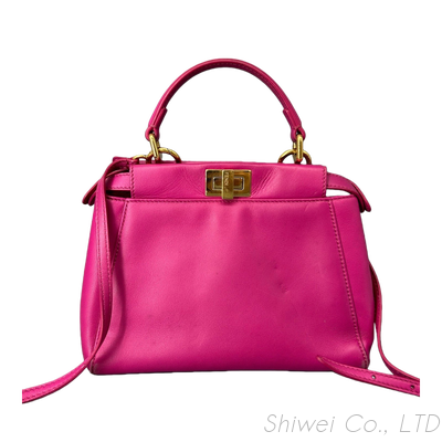 Add a vibrant pop of color to your collection with this Preloved High-end FENDI Mini Peekaboo Handbag Satchel Bag in Pink Leather. Crafted from luxurious smooth calfskin, this iconic Mini Peekaboo features Fendi's signature structured silhouette and gold-tone hardware, including the recognizable turn-lock closure for timeless sophistication.
