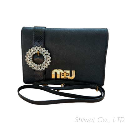 Add a touch of Italian sophistication to your collection with this Authentic Secondhand Miu Miu Chain Crossbody Shoulder Bag in Black Leather. Crafted from supple, grained calfskin leather, this chic bag features a structured silhouette enhanced by a dazzling crystal-embellished buckle and the iconic Miu Miu gold logo on the flap.