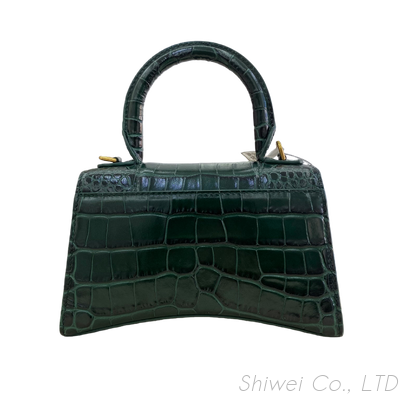 This pre‑owned Balenciaga Hourglass Small Top Handle bag is rendered in deep green croc‑embossed calfskin, bringing an exotic, high‑impact finish to one of the brand’s most iconic contemporary silhouettes. The sculpted hourglass shape, with its curved base and sharp angles, is emphasized by the structured leather and paneled construction.