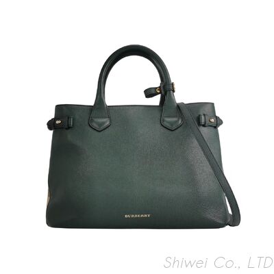 This certified used luxury Burberry Medium Banner Tote is crafted from rich forest‑green grained calfskin leather, framed on the sides by the brand’s signature House Check canvas. The structured rectangular silhouette and clean lines give the bag a refined, polished appearance that transitions seamlessly from office to off‑duty.