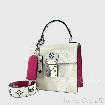 This pre-owned white patent leather top handle bag is a must have for fashion forward shoppers. It features a classic embossed monogram pattern that blends timeless charm with modern elegance. The glossy patent leather finish pairs with bold fuchsia side panels for a striking color contrast that catches the eye. The iconic silver tone twist lock closure ensures secure storage. The structured silhouette and sleek top handle offer a sophisticated handheld option. It also comes with a detachable wide monogram patterned shoulder strap for versatile crossbody or shoulder wear. The compact interior easily fits daily essentials like a smartphone, wallet and cosmetics. Sourced from a professional vintage collection, this bag retains premium craftsmanship and is in excellent condition. It offers luxury quality at an accessible price point. Perfect for daily commutes, brunch dates or evening events, this white patent leather handbag is an ideal choice for those seeking a vintage crossbody bag with detachable strap or a fuchsia accent shoulder bag that elevates any outfit.